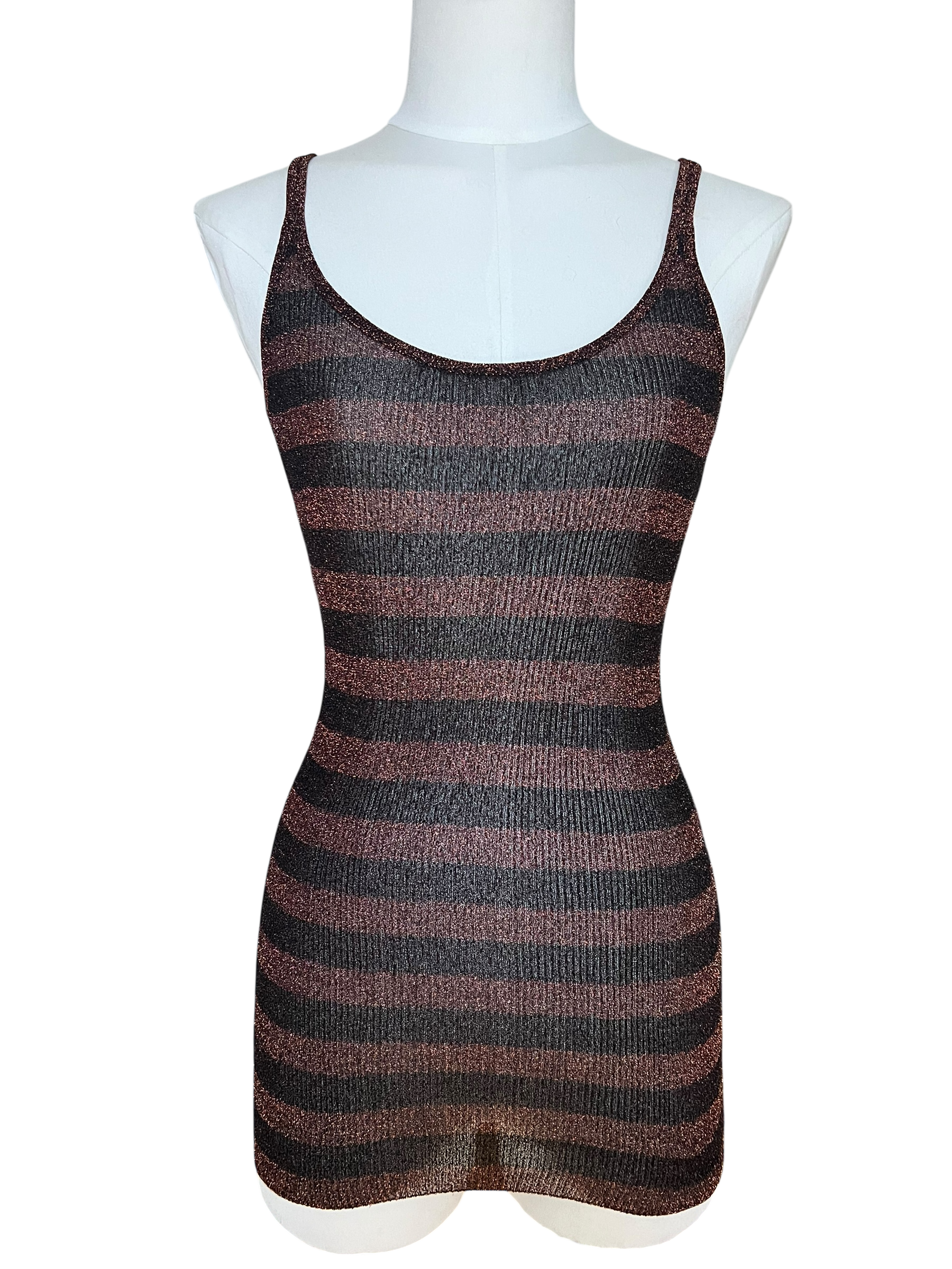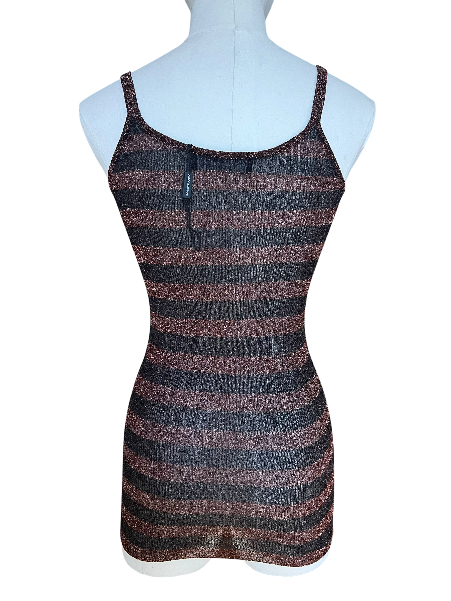 Dolce & Gabbana SS 2005 lurex tank top featuring bold horizontal stripes in shimmering bronze and deep charcoal tones. The fitted silhouette and scoop neckline enhance the body, while the metallic knit adds a subtle yet striking glow