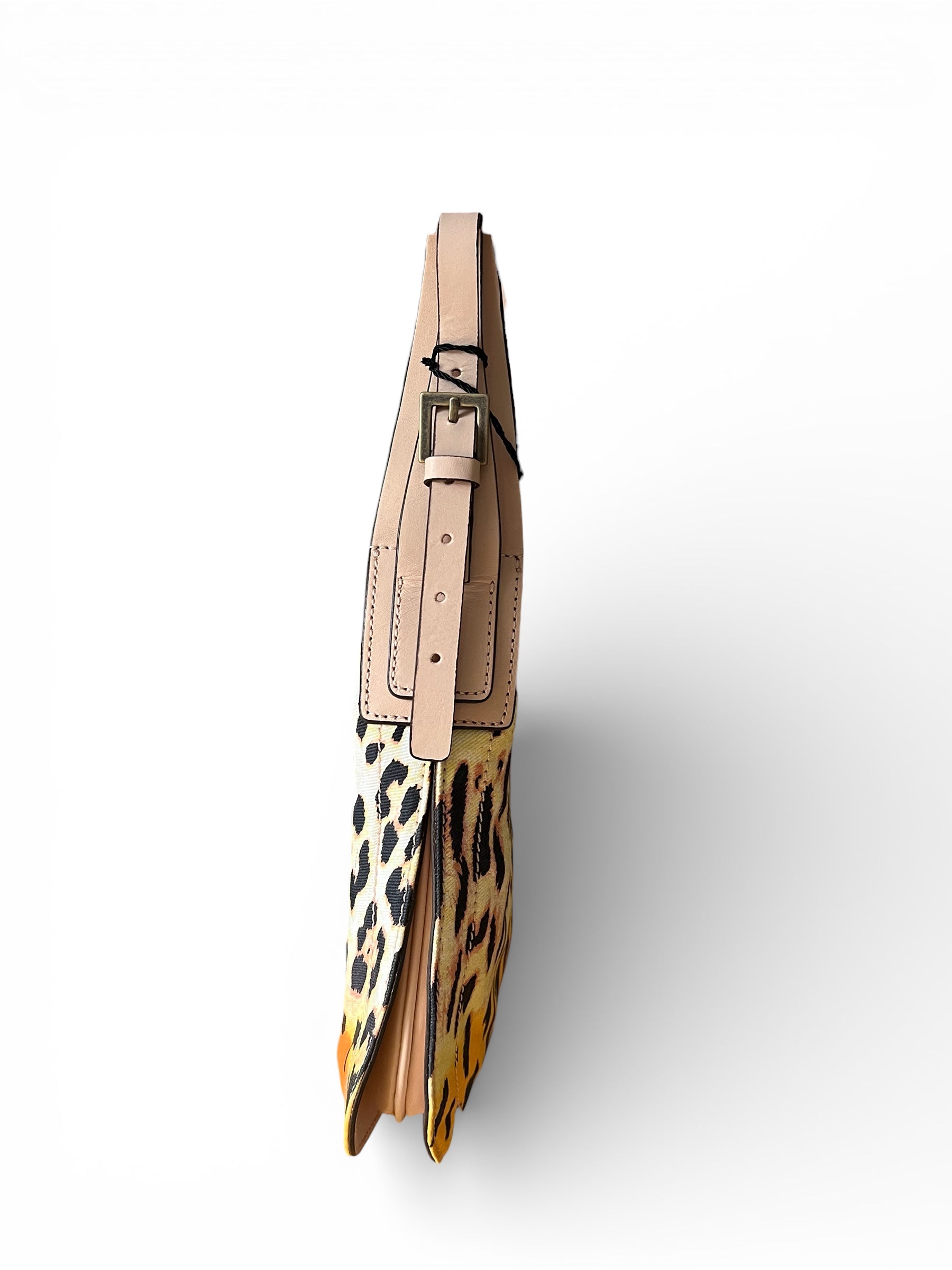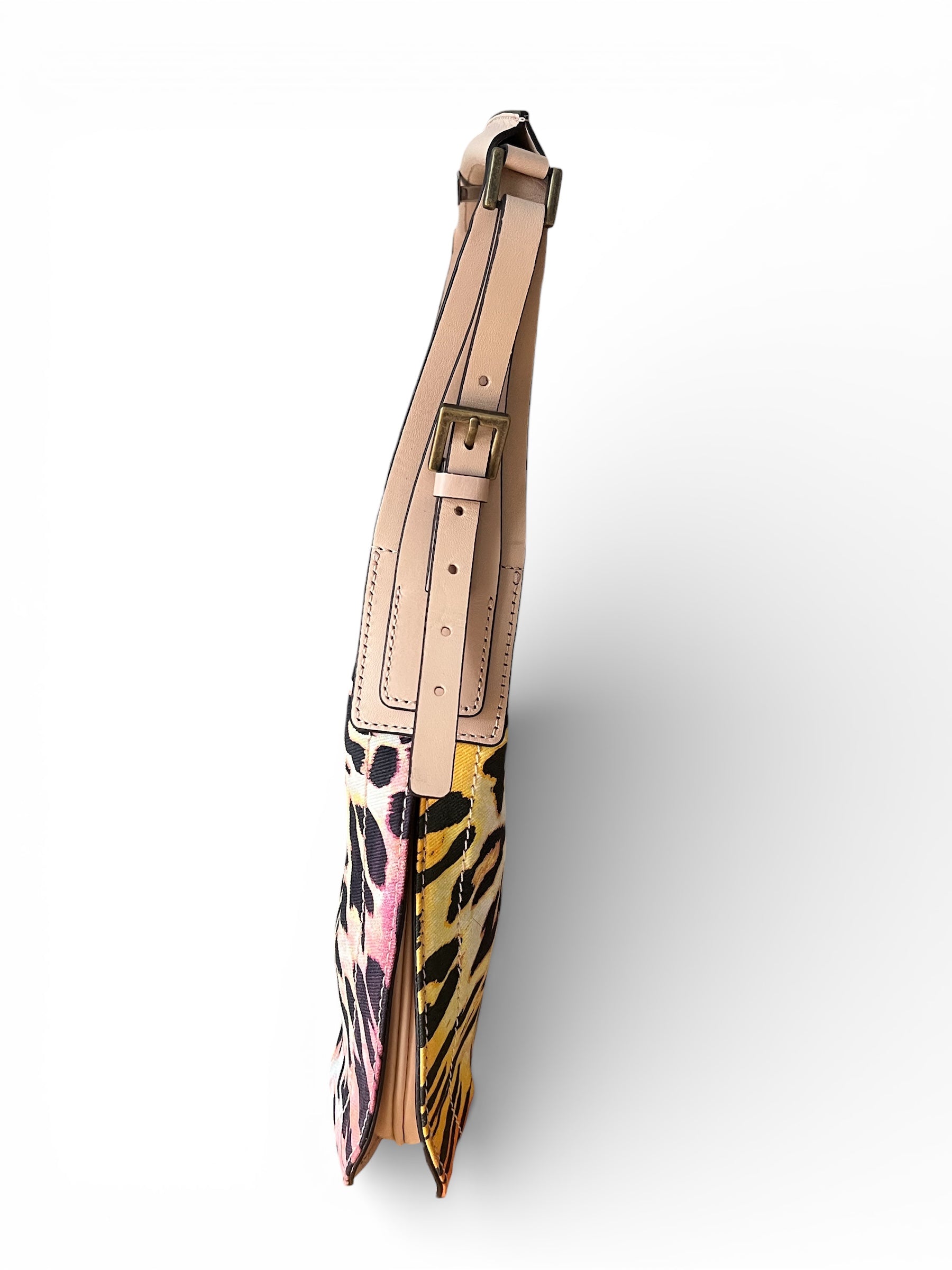 Just Cavalli shoulder bag featuring a bold animal print with warm sunset hues. Crafted in canvas fabric with leather trim and a comfortable shoulder strap, it embodies the brand’s iconic wild glamour.