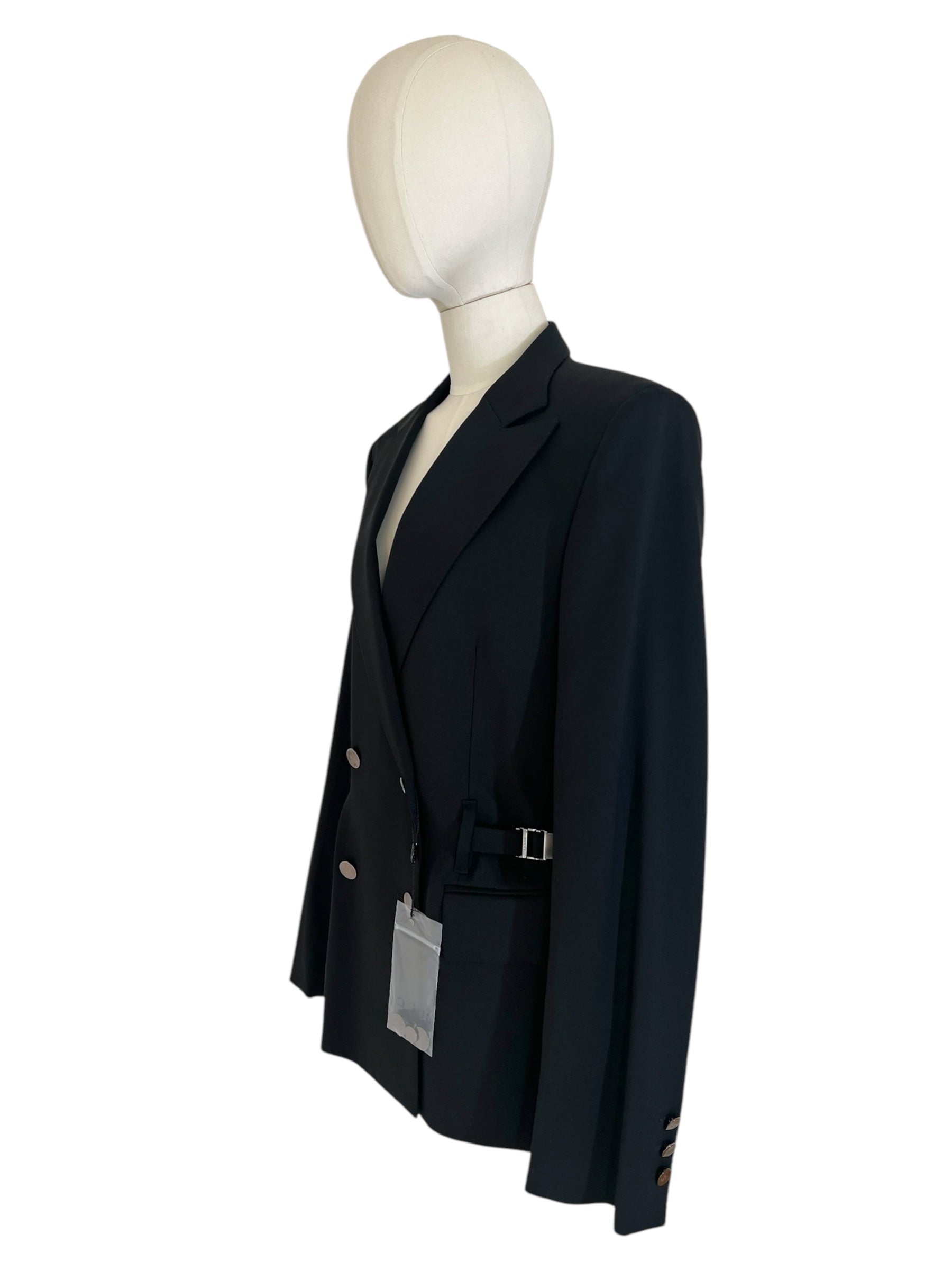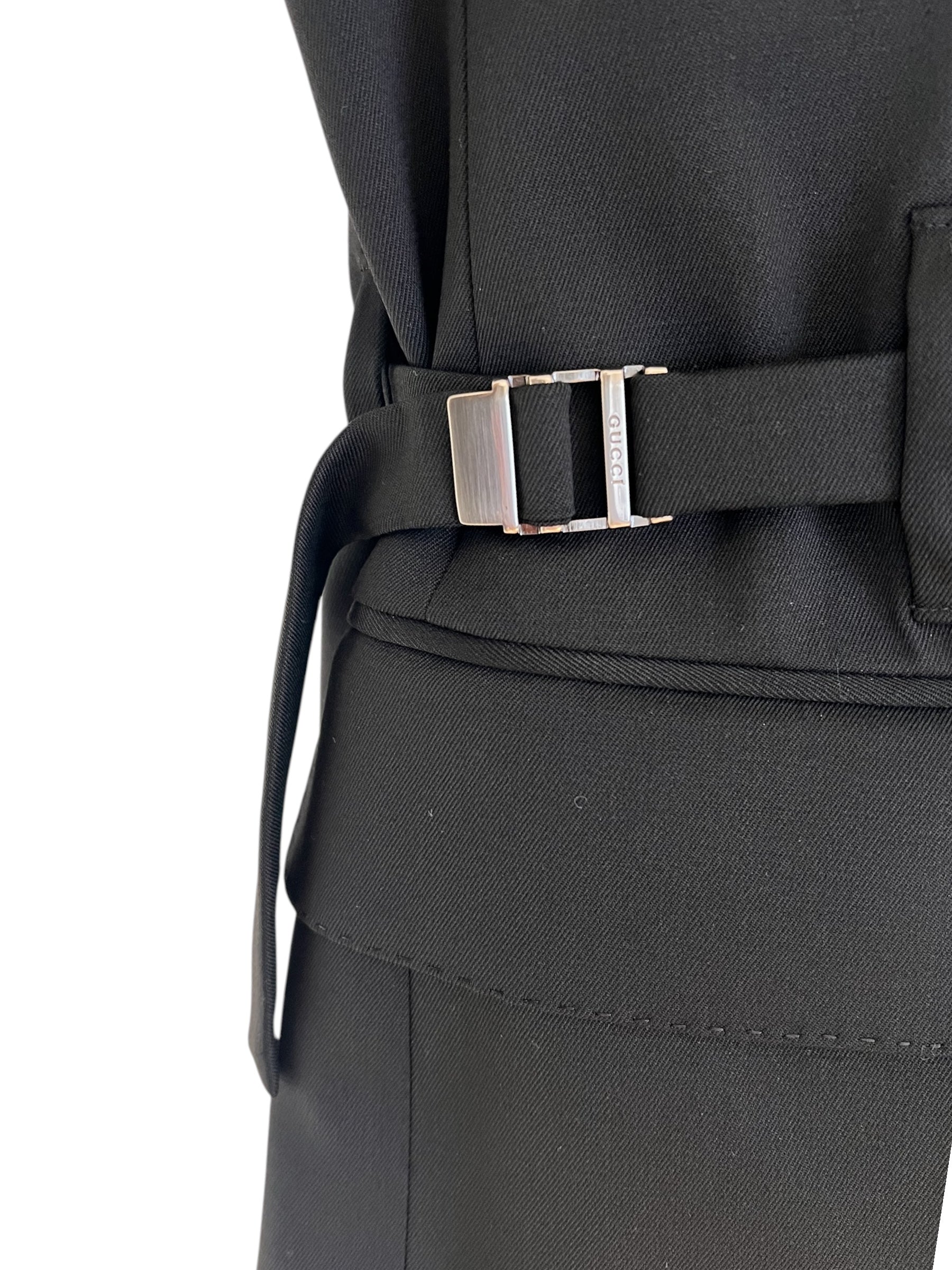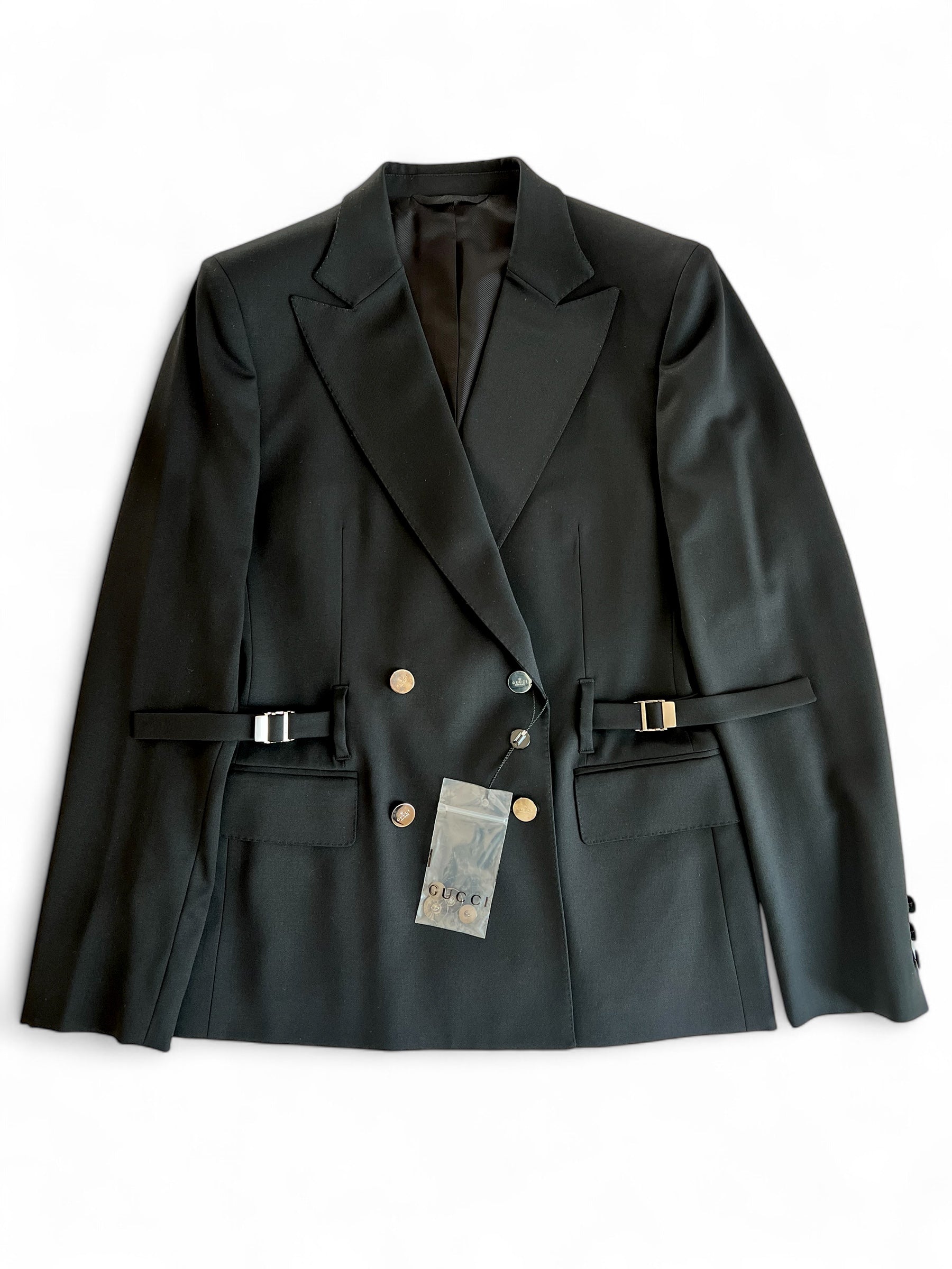 Gucci by Tom Ford black wool jacket. Double breasted with silver metal buttons and 2 regulators on side. Sold with Some extra buttons