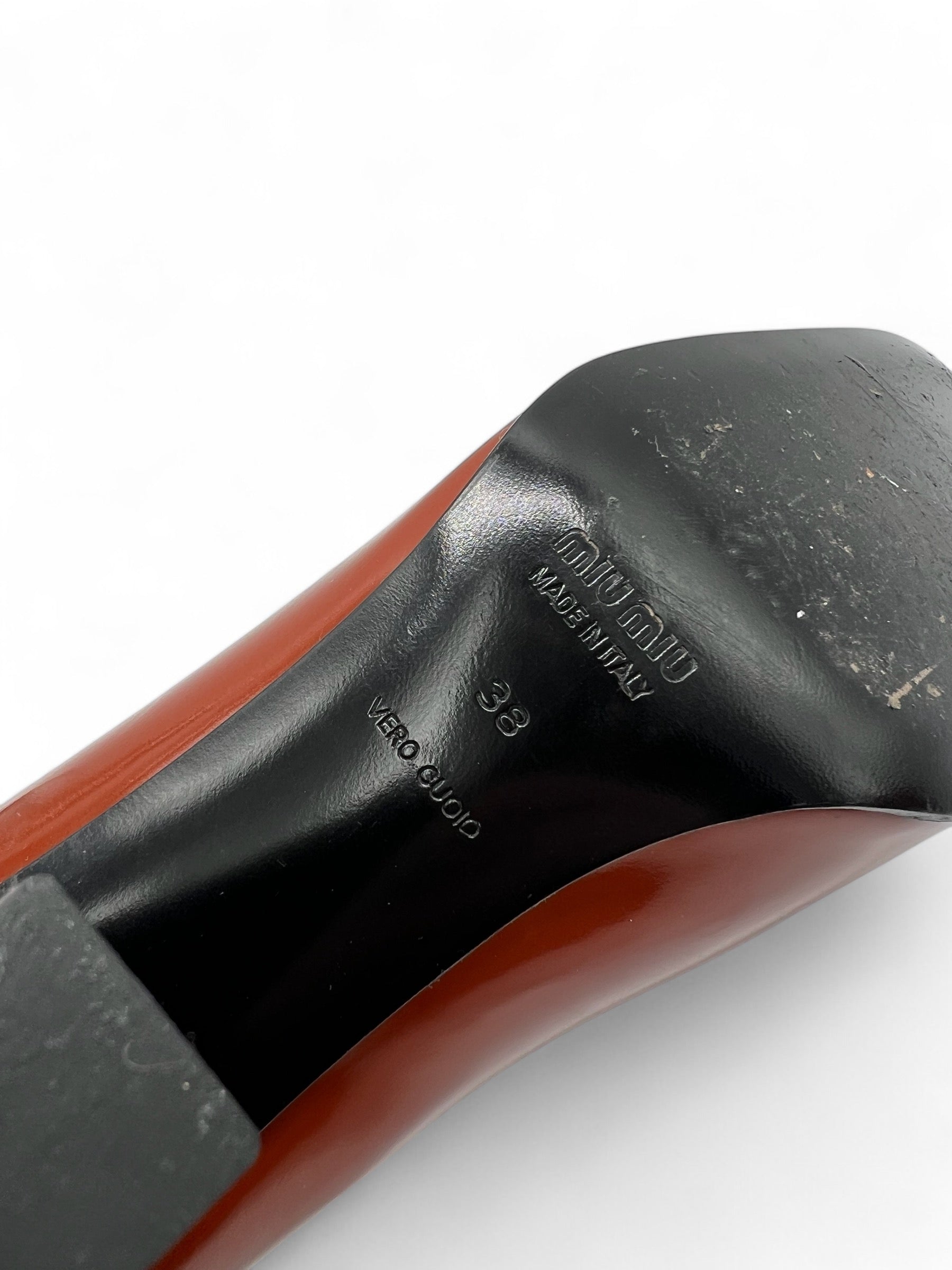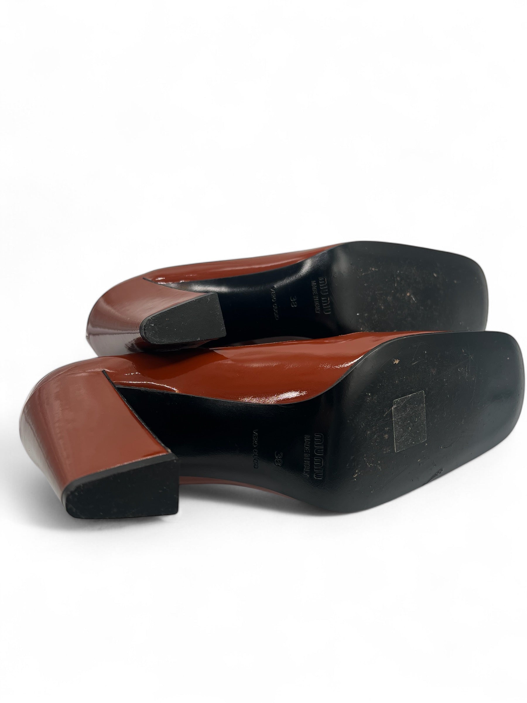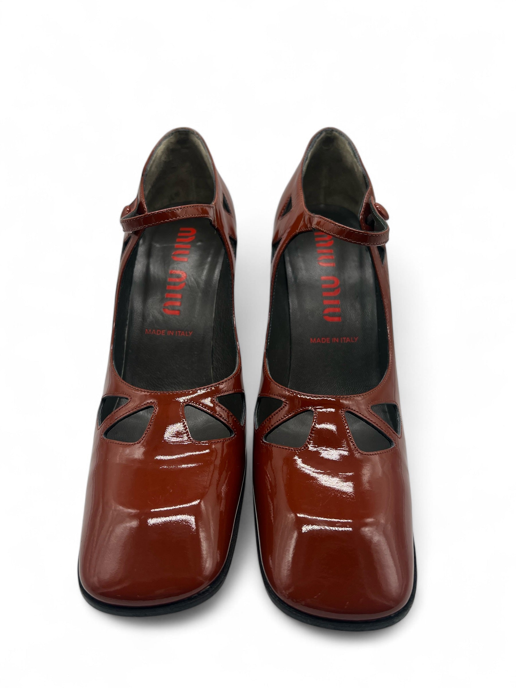 Miu Miu FW 2001 patent leather Mary Jane with front cut outs and ankle closure with little button. Shaped toe and chunky heels