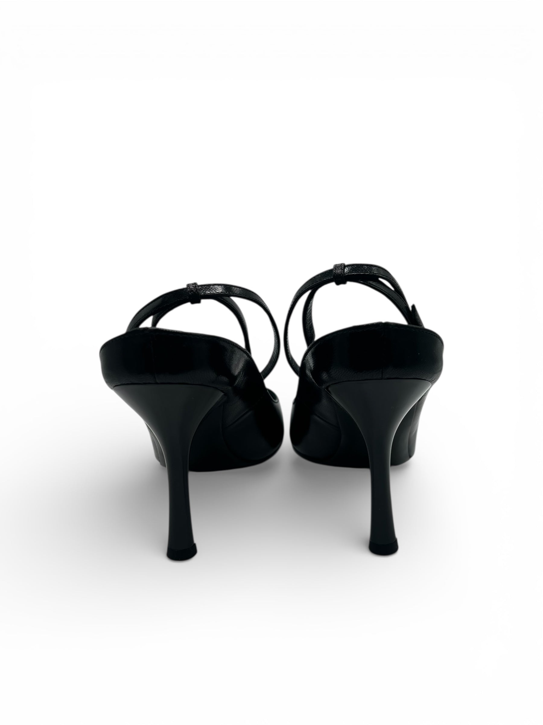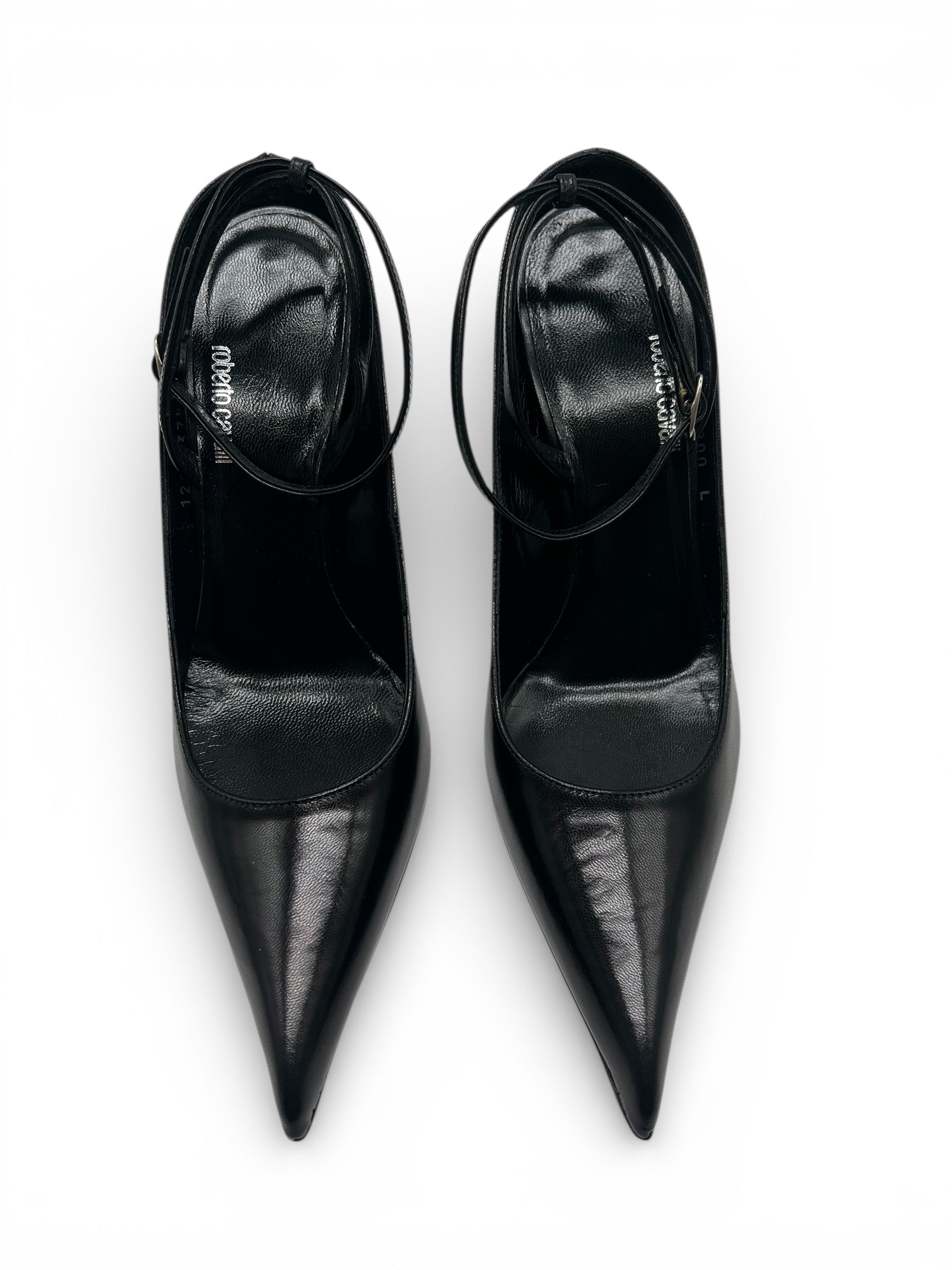 Roberto Cavalli black leather pumps featuring a sharp pointed toe and sleek ankle strap. The clean, sculpted silhouette enhances the foot with timeless elegance, while the minimalist design reflects the brand’s signature sensual sophistication