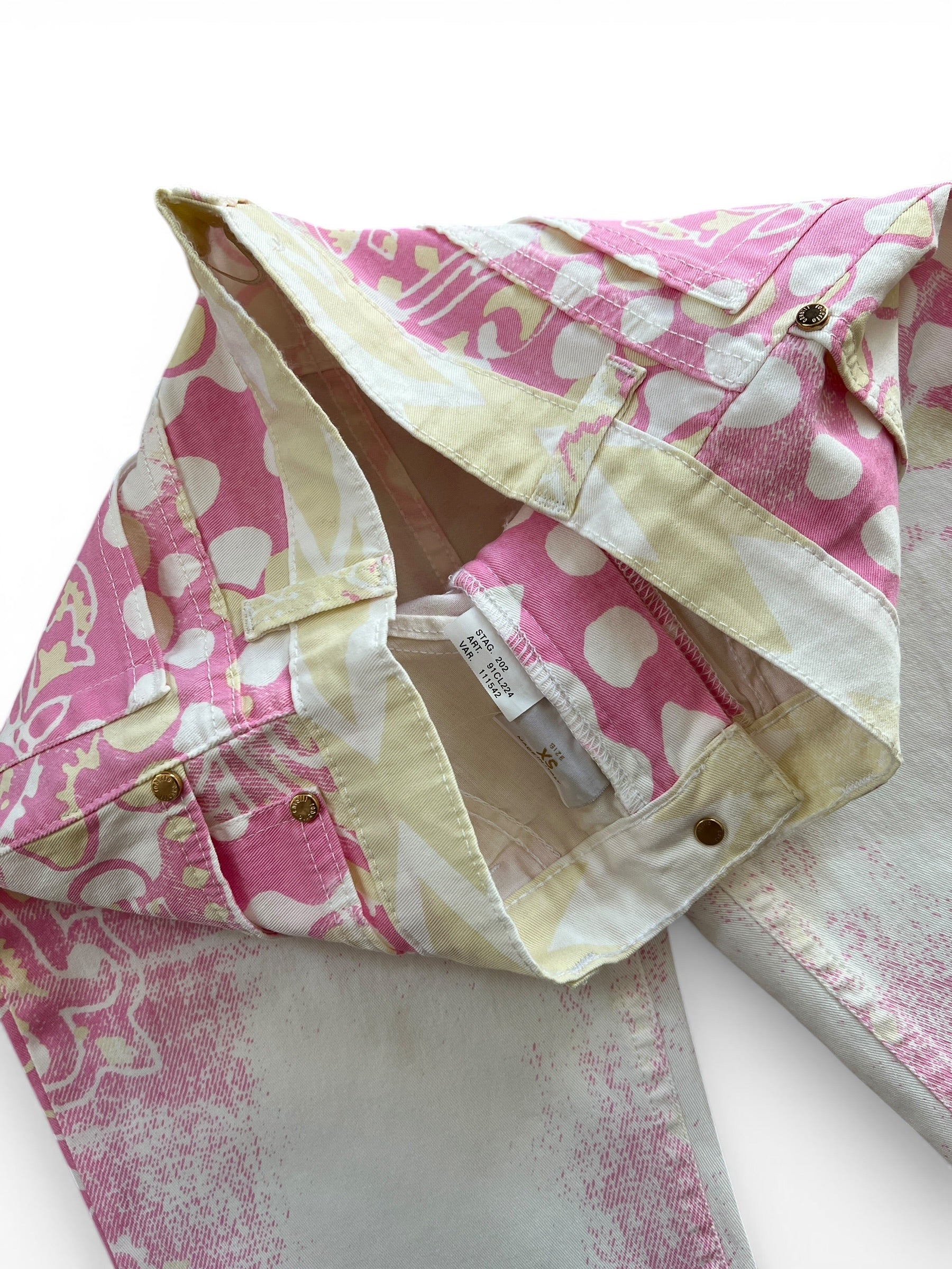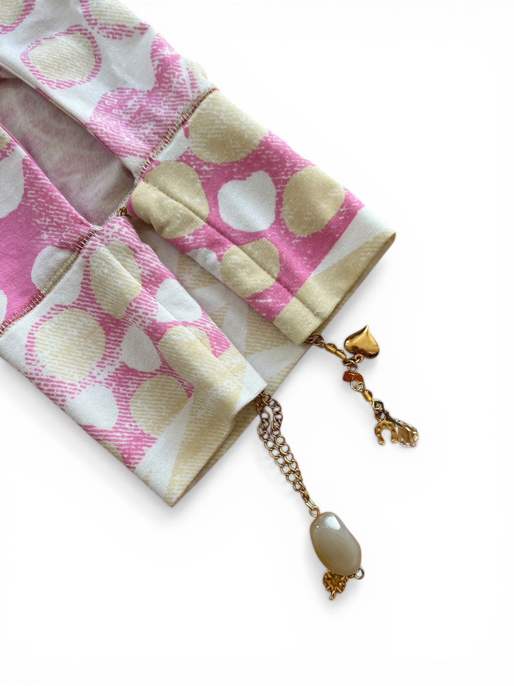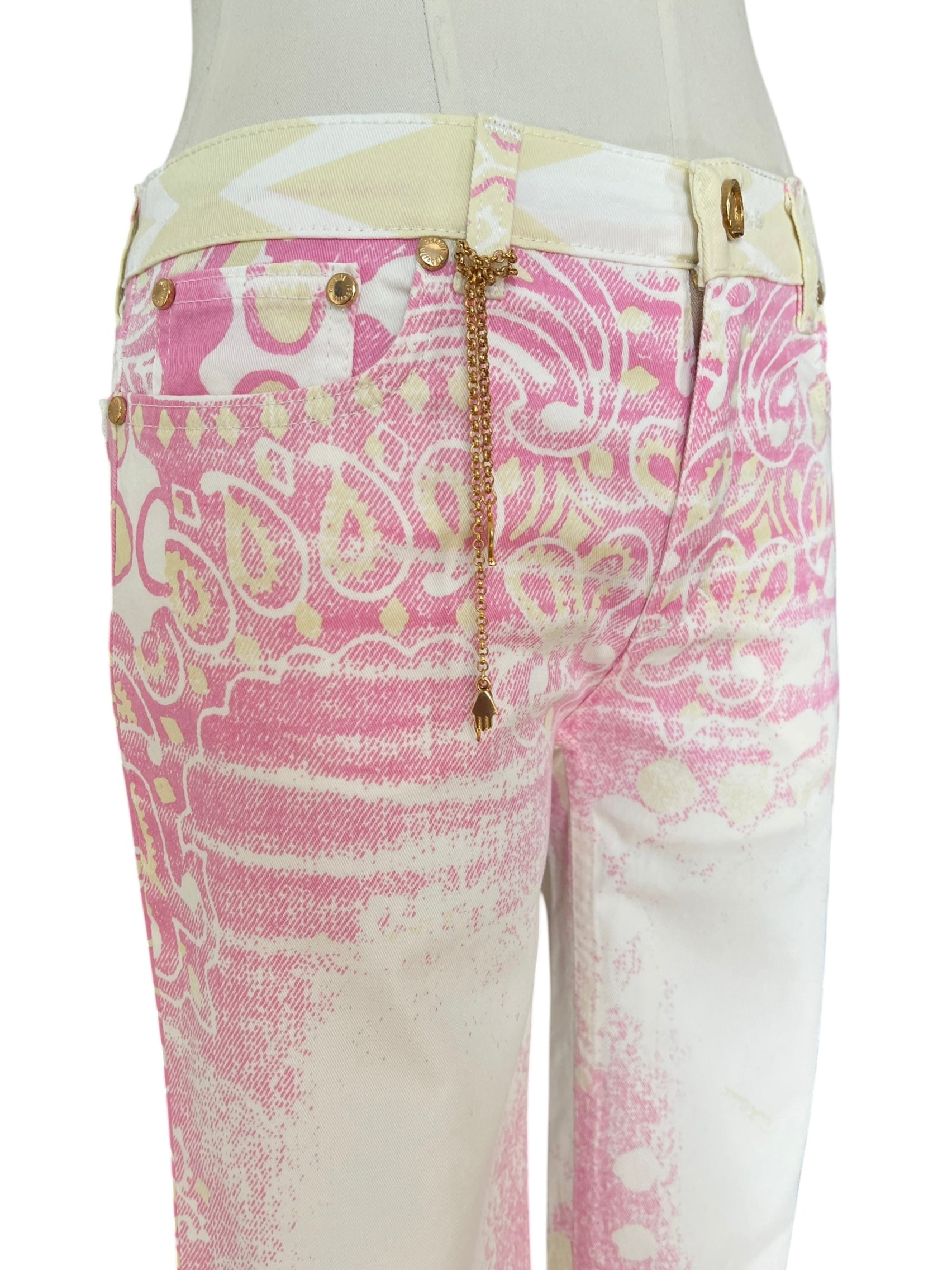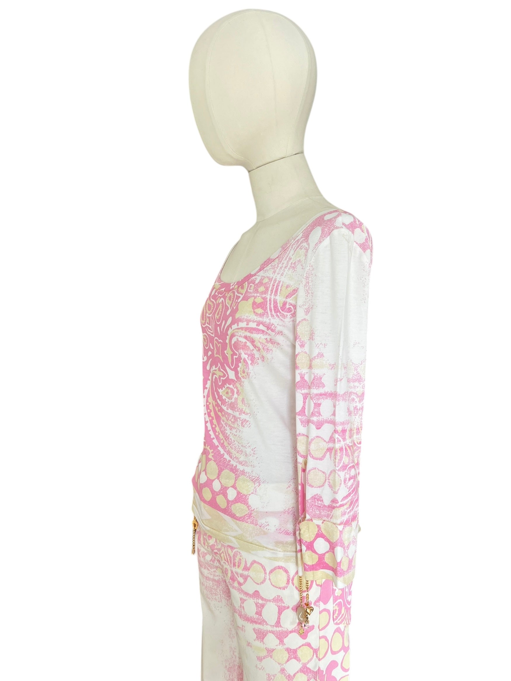 A striking early 2000s Roberto Cavalli mainline set featuring a 3/4 sleeve top and capri-length pants in soft pink and cream tones. The design showcases Cavalli’s signature paisley-inspired motifs combined with abstract dot patterns, creating a bold yet feminine Y2K aesthetic. Both pieces are elevated with iconic gold-tone charm details, including delicate chains and symbolic pendants, adding movement and a distinctive luxury touch typical of Cavalli’s runway-inspired designs from the era. Crafted in Italy from a lightweight stretch fabric, this set offers a flattering silhouette while remaining comfortable and easy to wear. Style together for a statement look or separately for versatile styling.